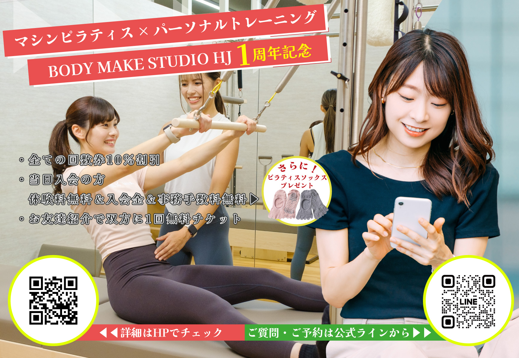 ・新規で当日入会の方は体験料無料、入会金&事務手数料無料、先着でピラティスソックスプレゼント